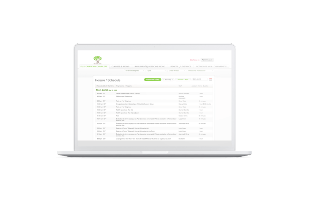 Découvrez nos offres dans le calendrier mensuel, votre ressource de référence pour tous les programmes et services disponibles. Explorez la gamme diversifiée de séances individuelles, d’ateliers, de cours et de groupes conçus pour soutenir votre bien-être.